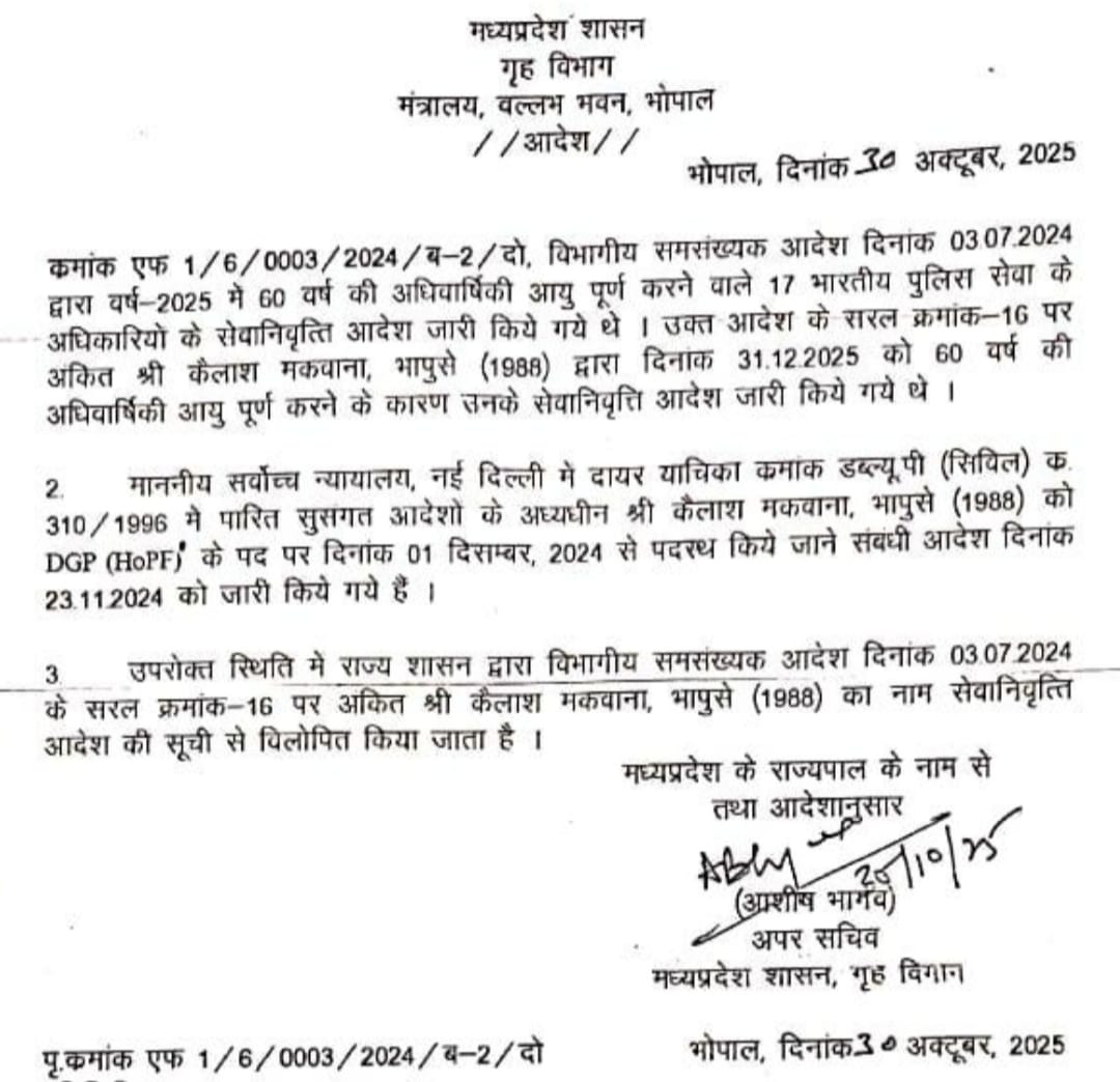 भोपाल। गृह विभाग ने प्रदेश के पुलिस महानिदेशक कैलाश मकवाना के सेवानिवृत्ति आदेश में करीब 11 माह बाद सुधार किया है। संशोधित आदेश के मुताबिक अब मकवाना नवंबर 2026 तक डीजीपी पद पर बने रहेंगे।