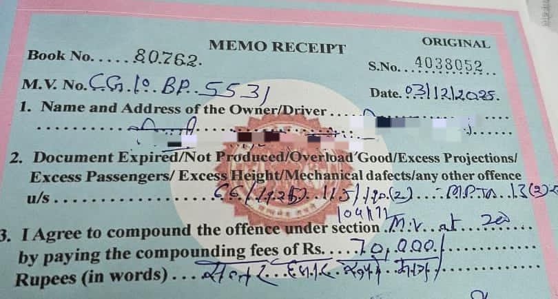 चेकिंग के दौरान ट्रक क्रमांक *CG 10 BP 5531* को यातायात नियमों का उल्लंघन ( नेशनल परमिट की शर्तों का उल्लंघन,प्रदूषण प्रमाण पत्र न होना आदि) करते पाए जाने पर रोककर दस्तावेजों एवं सुरक्षा मानकों की जांच की गई। आवश्यक नियमों का पालन न करने पर ट्रक को मौके पर ही जब्त कर प्रकरण तैयार कर अग्रिम कार्यवाही हेतु भेजा गया, जहां से वाहन संचालक पर *₹70,000 का जुर्माना* अधिरोपित किया गया।