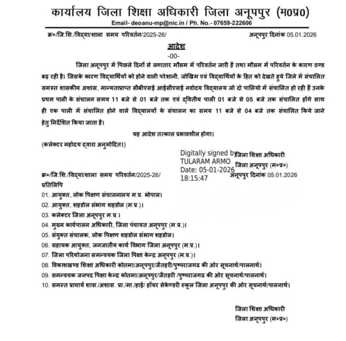 *अनूपपुर* जिले में लगातार मौसम में हो रहे परिवर्तन एवं बढ़ती ठंड को देखते हुए विद्यार्थियों के स्वास्थ्य एवं सुरक्षा के मद्देनज़र जिला शिक्षा अधिकारी अनूपपुर द्वारा स्कूलों के संचालन समय में परिवर्तन का आदेश जारी किया गया है।यह आदेश 05 जनवरी 2026 से तत्काल प्रभावशील होगा।