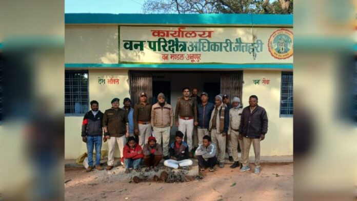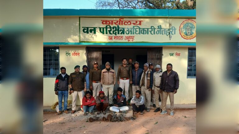 *अनूपपुर* वन परिक्षेत्र जैतहरी अंतर्गत एक वन्यप्राणी तेंदुए के मृत होने की सूचना प्राप्त होने पर वन परिक्षेत्र अधिकारी जैतहरी द्वारा मुख्य वन संरक्षक के निर्देशन एवं वनमण्डलाधिकारी एवं उप वनमंडलाधिकारी के मार्गदर्शन में एक टीम गठित कर जांच प्रारंभ की गई l जांच के दौरान डॉग स्क्वाड शहडोल की सहायता से संदिग्धों को वन विश्राम गृह जैतहरी लाकर पूछताछ की गई। पूछताछ के दौरान संदिग्धों द्वारा अपराध में शामिल व्यक्तियों की पहचान की गई जिन्हें वन विभाग टीम द्वारा गिरफ्तार कर वन विश्राम लाया गया एवं अपने अभिरक्षा में लेकर उनसे पूछताछ की गई जिस दौरान सभी ने अपना अपराध स्वीकार किया जिसमें सूरज भारिया 21 वर्ष , नोहर कोल 25 वर्ष, सुखलाल भैना 32 वर्ष, हीरालाल कोल 38 वर्ष सभी निवासी जैतहरी वार्ड क्रमांक 15 शामिल थे। उनके द्वारा बताया गया कि हम लोग सभी मिल कर जंगली सूअर का शिकार करने के लिए तार लगाए थे जिसमें तेंदुआ फंस गया l हम लोग डर के कारण तेंदुआ के शव को को घसीट के वनविभाग के द्वारा खोदी गई खाई में फेक दिए और तार ,बांस की खूंटी, शीशी सबको दूर नदी के दूसरे तरफ वाले जंगल में छिपा दिए।सभी अपराधियों को साथ ले जाकर घटना स्थल एवं सामान छिपाने वाले स्थान की शिनाख्त करवाई गई इसके बाद समान की जप्ती कर मौका पंचनामा तैयार किया गया l सभी अपराधियों को विवेचना उपरांत उनके विरुद्ध वन अपराध क्रमांक 4795/5 वन्य प्राणी संरक्षण अधिनियम 1972 की धारा 2(16) (a)(b), 9,39, 50, 51,52 के तहत अपराध पंजीबद्ध कर न्यायालय अनूपपुर में पेश किया गया जहां से सभी अपराधियों को जिला जेल अनूपपुर भेज दिया गया।