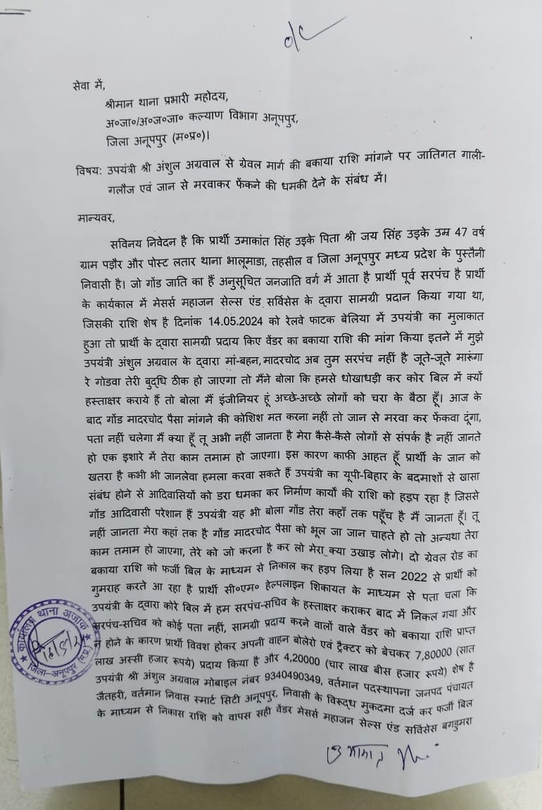 *कोतमा* जनपद पंचायत अनूपपुर अंतर्गत ग्राम पंचायत पडौर के पूर्व सरपंच उमाकांत सिंह ने हाल ही में अजाक़ थाना प्रभारी को एक शिकायत दर्ज कराई है, जिसमें उन्होंने उपयंत्री अंशुल अग्रवाल पर गंभीर आरोप लगाए हैं।उमाकांत सिंह ने बताया कि जब उन्होंने ग्रेवल मार्ग की बकाया राशि की मांग की,तो अंशुल अग्रवाल ने उन्हें जातिगत गालियां दीं और जान से मारने की धमकी दी