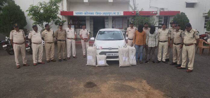 जानकारी के अनुसार उड़ीसा से कार में गांजा की खेप लाए जाने की सूचना पर पुलिस अधीक्षक जितेन्द्र सिंह पवॉर, अतिरिक्त पुलिस अधीक्षक इसरार मन्सूरी के निर्देशन में कोतमा थाना प्रभारी सुन्द्रेश मरावी ने कदमटोला के जंगल में घेरा बंदी करते हुए कार क्रमांक सीजी 04 एचएल 2137 को रोकते हुए कार की तलाशी ली गई। जहां तलाषी के दौरान कार के अंदर से 5-5 किलो के 14 पैकेट में कुल 70 किलो गांजा जब्त करते हुए दो अरोपियों महेन्द्र उर्फ बिन्दा सोनी एवं आंगद सिंह गोड़ को पकड़कर थाना लाया गया, वहीं मौके से विनय सोनी उर्फ गुड्डी निवासी सोहागपुर जिला शहडोल मौके से फरार हो गया। वहीं पकड़े गए आरोपियों से पूछताछ के दौरान दोनो आरोपियों ने बताया कि 30 जून रविवार को वे कार से गांजा की खेप लेने उड़ीसा गए थे। जहां से कार में गांजा लोड़ कर शहडोल जिले के ब्यौहारी में किसी हजारी साकेत के यहां जा रहे थे। इस दौरान कोतमा पुलिस ने कदमटोला जंगल के पास उक्त कार रोका गया, इस दौरान गांजा लोड़ कार को फॉलोअप में लगी कार भी मौके से भाग निकली, जिसका कोतमा पुलिस द्वारा फुनगा तक पीछा किया गया था। पूछताछ के दौरान आरोपियों ने बताया फॉलो में लगी कार से सद्दाम खान निवासी मनेन्द्रगढ़ द्वारा पॉयलेटिंग की जाती रही है। जिसके बाद पुलिस ने दो आरोपियों महेन्द्र उर्फ बिन्दा सोनी, आंगद सिंह गोड़ पिता सुरेश सिंह गोड़ को गिरफ्तार कर लिया गया है, वहीं 3 आरोपी जिनमें विनय सोनी निवासी सोहागपुर जिला शहडोल, सद्दाम खान निवासी मनेन्द्रगढ़ एवं हजारी साकेत निवासी ब्यौहारी जिला शहडोल फरार बताये जा रहे है, जिनकी पुलिस तलाष में जुटी हुई है।