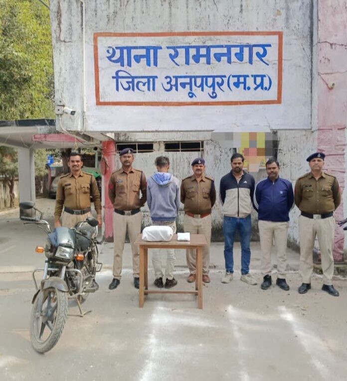 अनूपपुर* पुलिस अधीक्षक के निर्देशन में थाना रामनगर पुलिस द्वारा मादक पदार्थों की अवैध बिक्री पर अंकुश लगाने हेतु चलाए जा रहे विशेष अभियान के तहत दिनांक 28.01.2026 को मुखबिर से प्राप्त सूचना के आधार पर थाना रामनगर पुलिस द्वारा कार्रवाई करते हुए आरोपी के कब्जे से अवैध मादक पदार्थ गांजा 3.093 किलोग्राम (अनुमानित कीमत ₹1,50,000) एवं एक काले रंग की हीरो स्प्लेंडर प्लस मोटरसाइकिल (सोल्ड), इंजन नंबर HA11E7SHB51319, चेचिस नंबर MBLHAW223SHBA5314अनुमानित कीमत 1,00,000 को साक्षियों के समक्ष विधिवत जप्त कर पुलिस कब्जे में लिया गया।आरोपी दुर्गेश महरा पिता भीमसेन महरा,उम्र 24 वर्ष, निवासी बड़का मोहल्ला झिरिया चौकी केशवाही,थाना बुढार, जिला शहडोल को गिरफ्तार कर जप्तशुदा मादक पदार्थ एवं वाहन के साथ थाना लाकर आरोपी के विरुद्ध अपराध क्रमांक 28/26, धारा 8/20(B) एनडीपीएस एक्ट पंजीबद्ध कर दंडनीय पाए विवेचना में लिया गया।तत्पश्चात आरोपी को माननीय न्यायालय अनूपपुर में पेश किया गया,जहाँ से उसे न्यायिक अभिरक्षा में जेल भेजा गया।