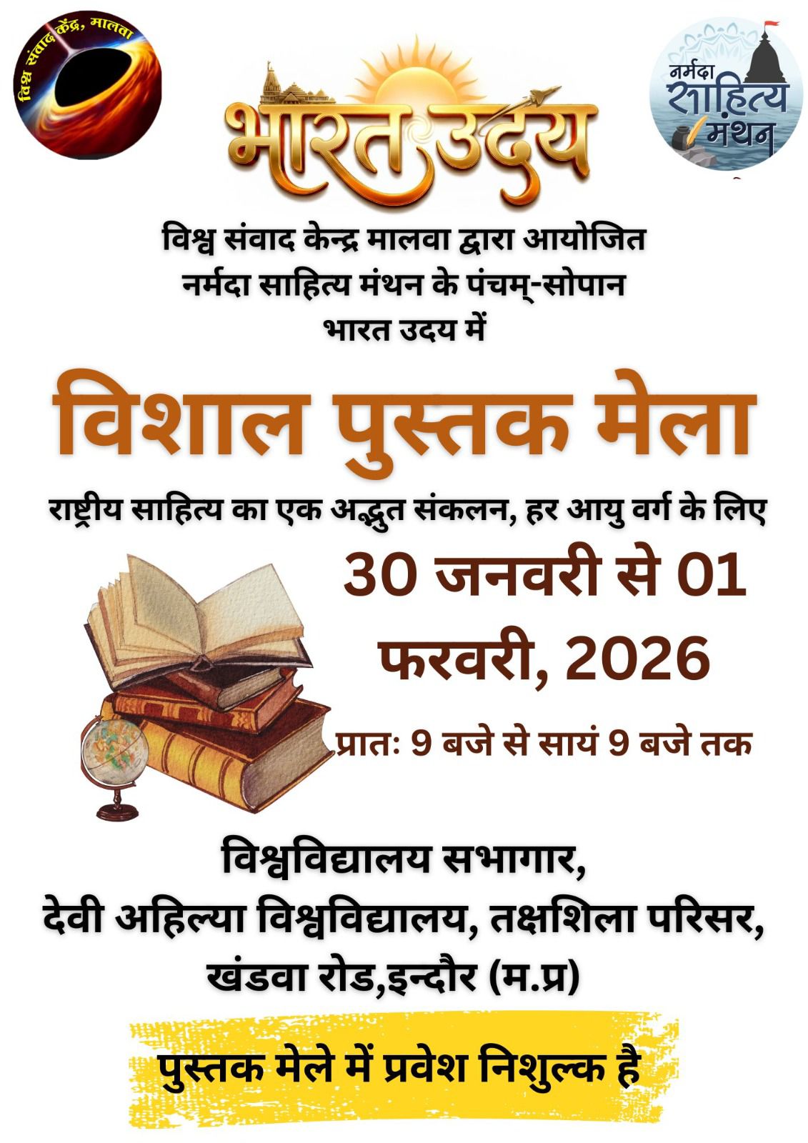 विश्व संवाद केंद्र मालवा द्वारा आयोजित नर्मदा साहित्य मंथन के पंचम सोपान ‘भारत उदय’ के अंतर्गत इंदौर में तीन दिवसीय विशाल पुस्तक मेला एवं प्रदर्शनी का आयोजन किया जा रहा है। यह आयोजन 30 जनवरी से 1 फरवरी 2026 तक देवी अहिल्या विश्वविद्यालय के तक्षशिला परिसर स्थित विश्वविद्यालय सभागार में होगा। पुस्तक मेला प्रतिदिन प्रातः 9 बजे से सायं 9 बजे तक आमजन के लिए खुला रहेगा तथा इसमें प्रवेश निःशुल्क रहेगा।