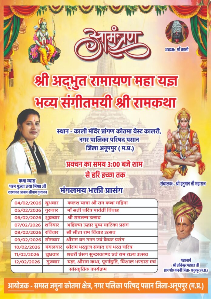 जमुना कोतमा अनूपपुर माँ नर्मदा की पावन धरती के अंतर्गत जमुना–कोतमा क्षेत्र स्थित माँ काली मंदिर प्रांगण, कोतमा वेस्ट कॉलरी, नगर पालिका परिषद पसान, जिला अनूपपुर म.प्र. में आगामी 4 फरवरी 2026 बुधवार से श्री अद्भुत रामायण महायज्ञ एवं भव्य संगीतमयी श्रीराम कथा का आयोजन श्रद्धा और भक्ति के साथ किया जा रहा है यह धार्मिक अनुष्ठान 12 फरवरी 2026 तक प्रतिदिन आयोजित होगा।