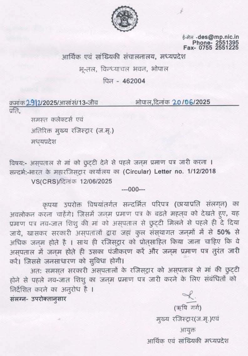 अनूपपुर / प्रसव के बाद अस्पताल से माँ की छुट्टी होने से पहले ही नवजात शिशु का जन्म प्रमाण-पत्र जारी हो जाए। मुख्य रजिस्ट्रार (जन्म मृत्यु) एवं आयुक्त आर्थिक एवं सांख्यिकी मध्यप्रदेश ऋषि गर्ग ने इस आशय के निर्देश संबंधित अधिकारियों को दिए हैं। पंजीकरण प्रक्रिया को सुगम और उपयोगकर्ता के अनुकूल बनाने के अपने प्रयास में, भारत के महारजिस्ट्रार कार्यालय ने नागरिक पंजीकरण प्रणाली में सुधार के लिए कई कदम उठाए हैं, जिसमें जन्म एवं मृत्यु रजिस्ट्रीकरण अधिनियम, 1969 में संशोधन, राज्य जन्म एवं मृत्यु पंजीकरण नियमों में संगत संशोधन, एक नए केंद्रीय सीआरएस पोर्टल का विकास आदि शामिल हैं। जन्म प्रमाण पत्र के बढ़ते महत्व को देखते हुए, यह समय की मांग है कि यह प्रमाण पत्र नवजात शिशु की मां को अस्पताल से छुट्टी मिलने से पहले ही दे दिया जाए, खासकर सरकारी अस्पतालों द्वारा जहां कुल संस्थागत जन्मों में से 50 प्रतिशत से अधिक होते हैं। जन्म प्रमाण-पत्र अत्यंत महत्वपूर्ण दस्तावेज है। राज्य शासन के आर्थिक एवं सांख्यिकी विभाग द्वारा अस्पताल में ही नवजात शिशु का जन्म प्रमाण-पत्र बनाने के लिये दिशा-निर्देश जारी किए गए हैं। इससे जन साधारण को अपने शिशु का जन्म प्रमाण-पत्र बनवाने के लिए इधर-उधर नहीं भटकना पड़ेगा।