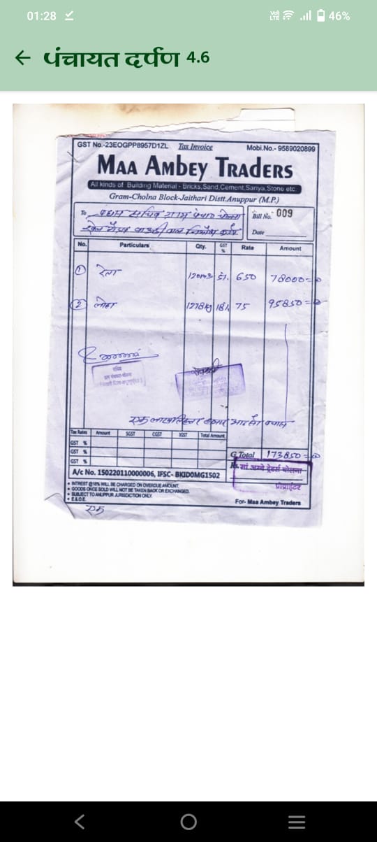 *अनूपपुर* जैतहरी जनपद पंचायत अंतर्गत ग्राम पंचायत चोलना में संचालित माँ अम्बे ट्रेडर्स फर्म संचालक द्वारा विभिन्न ग्राम पंचायतों से निर्माण सामग्री सप्लाई के एवज में फर्म का बिल लगाकर लाखो की राशि का भुगतान प्राप्त किया गया है।